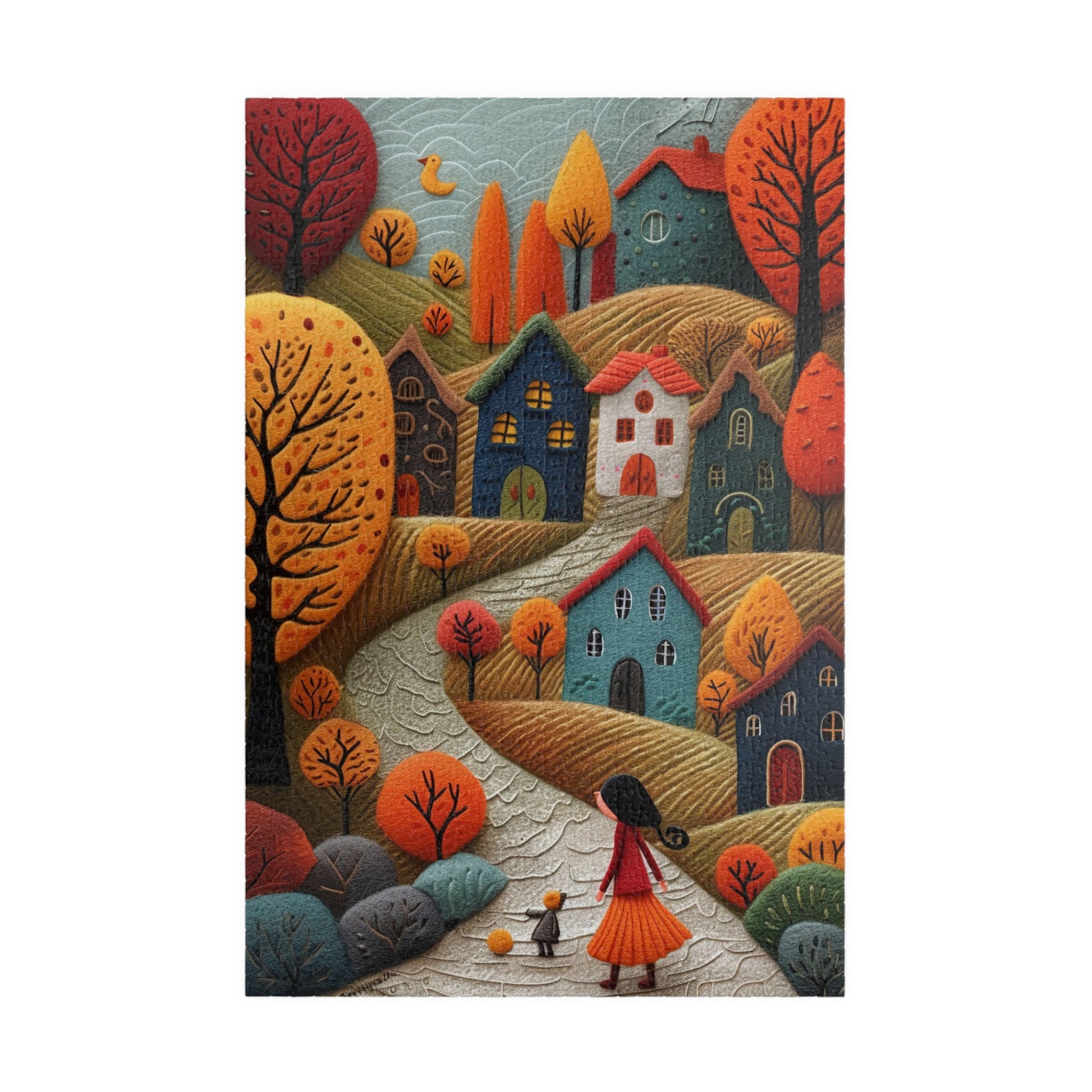 Lose yourself in a whimsical felt world with our vibrant puzzle! Tackle varying shades of autumn bliss, quaint houses, and a stylish character. Perfect balance of charming detail and tricky large color fields for puzzle lovers!